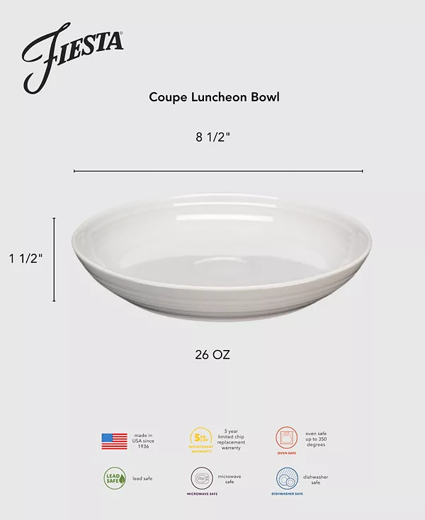 Добавьте нотку свежести в трапезу с этим набором из четырех белых мисок для ланча от Fiesta. Компактные, но универсальные, эти миски объемом 26 унций идеально подходят для пасты, салатов, мисок для каши, жаркого, супа или хлопьев. Благодаря площади поверхности тарелки и слегка приподнятому ободу, они аккуратно сохраняют продукты для любого приема пищи или перекуса. Сочетайте их с другими предметами и оттенками для индивидуальной сервировки стола.