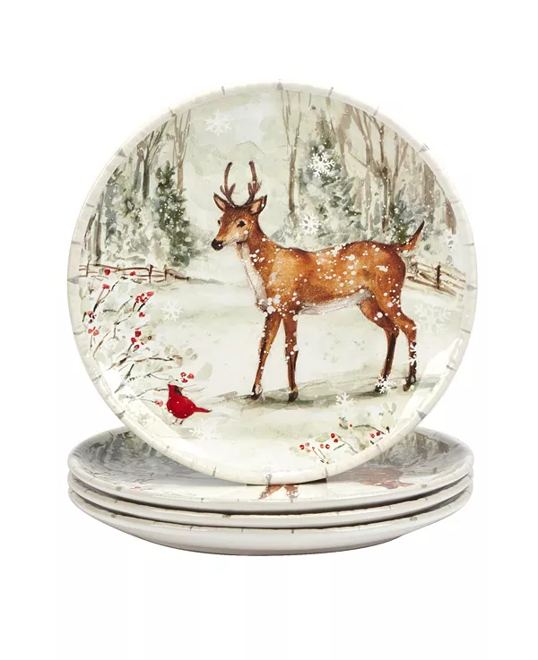 Очаровательный лесной олень в своей зимней среде обитания украшает керамический набор обеденных тарелок Winter's Walk от Certified International, созданный художницей Сьюзан Уингет. В этом прекрасном снежном пейзаже к ним присоединяются красные кардиналы, а ободки украшены рельефной и расписанной вручную белой березой.
