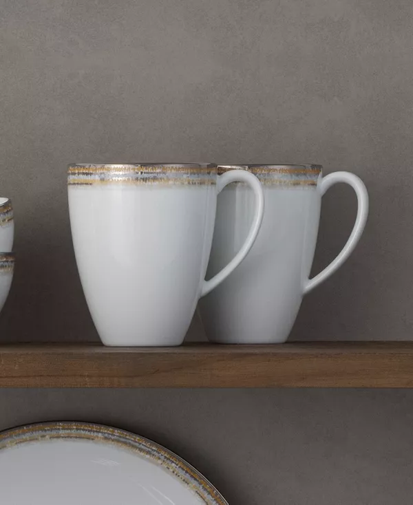 Кружки Raylan от Noritake идеально подходят для подачи горячих напитков семье и гостям. Они сочетают в себе функциональность и современный дизайн. Каждая кружка украшена размытым узором из смешанных металлических элементов на белом фарфоре и украшена блестящей платиновой полосой.