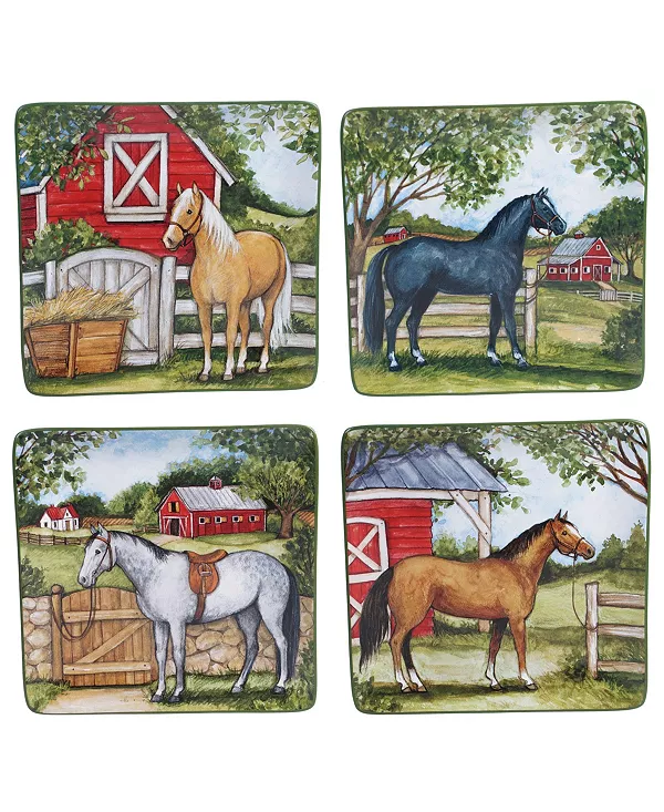 Прекрасные лошади, изображённые на каждом предмете керамической посуды и сервировочных принадлежностей «Clover Farm» от Certified International, – это работы Сьюзан Уингет. Её любовь к лошадям прослеживается в каждом изображении, а красочная объёмная банка для печенья в виде конюшни добавляет ещё больше веселья.