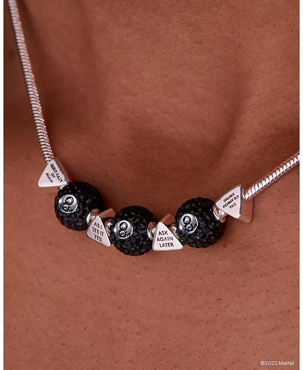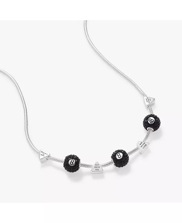Позвольте судьбе определить ваш стиль. Это ожерелье-слайдер «Волшебная восьмёрка» привнесёт ностальгию по классической игре в ваш повседневный образ благодаря бусинам из чёрного янтаря и треугольным слайдерам с выгравированными дерзкими надписями, такими как «Спросите позже» и «Знаки указывают на «да»». На изящной цепочке-змейке с регулируемым удлинителем это идеальное украшение для воплощения игривой интуиции, какой бы ни была судьба.