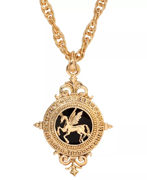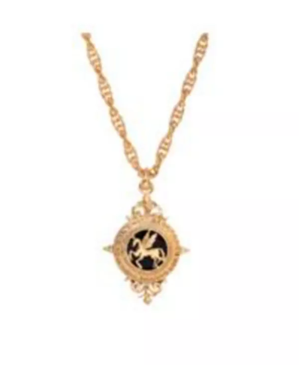 Это ожерелье излучает старинную элегантность благодаря изысканному кулону, вдохновленному акантом и покрытому 14-каратным золотом. Он украшен круглым ониксом в центре и эффектным золотым Пегасом.