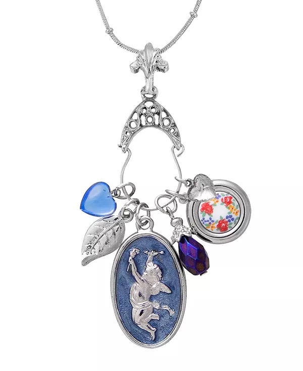 Этот очаровательный кулон представляет собой держатель в форме гребешка и филигранной вилочки, украшенный шестью различными подвесками: ярким синим сердцем, нежным листом, крылатым херувимом, сверкающей синей огнеполированной бусиной, круглой цветочной наклейкой и гравированным сердцем.