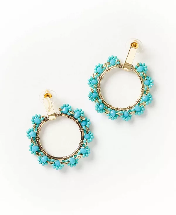 Наша коллекция Jatasya сочетает в себе традиционные техники бисероплетения и ювелирного искусства, создавая привлекательные современные украшения в бирюзовых и золотистых тонах. Эти серьги-кольца ручной работы украшены золотистой проволокой с бахромой из гранёных стеклянных бусин бирюзового цвета.