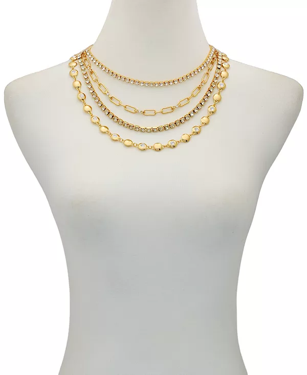 Создайте яркий образ с этим ожерельем GUESS с многослойным дизайном и сияющим золотым покрытием. Ряды сверкающих стразов и полированных металлических бусин переплетаются с изящной цепочкой, а удлинитель длиной 5 см позволяет регулировать длину для индивидуальной посадки.