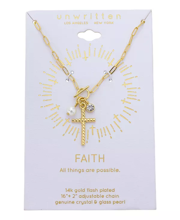 Примите свою веру с ожерельем с подвеской «Ненаписанный крест и кристалл», украшенным сверкающими символами духовности от Unwritten.
