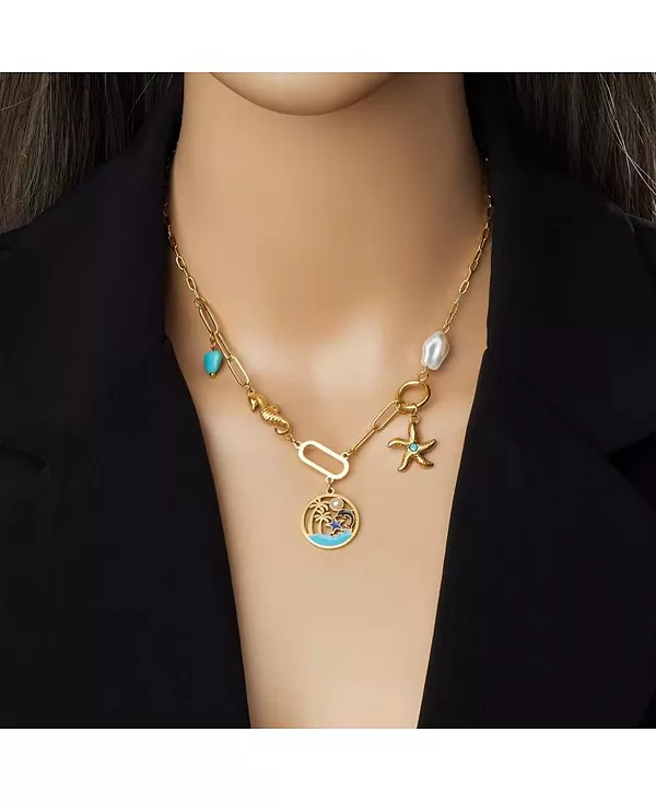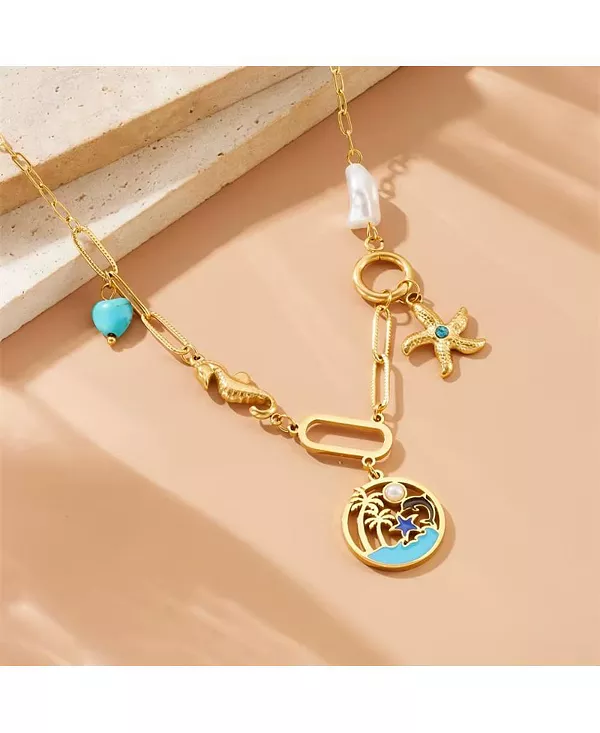 Подчеркните свой стиль этим потрясающим позолоченным ожерельем, вдохновленным океаном. Уникальное сочетание подвесок на морскую тематику, включая ослепительную морскую звезду с бирюзовым акцентом, изящного морского конька и сказочную эмалированную подвеску с изображением пляжа, добавит тропическую элегантность любому образу. Тонкая ручная работа и причудливый дизайн делают это ожерелье идеальным как для повседневной носки, так и для особых случаев. Прекрасное сочетание прибрежного очарования и изысканности, это ожерелье также станет прекрасным подарком для любителей океана.