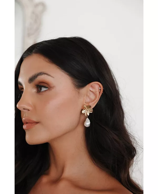 Эти потрясающие серьги с золотыми цветочными гвоздиками и уникальными каплями из пресноводного жемчуга в стиле барокко добавят вашему образу элегантности.