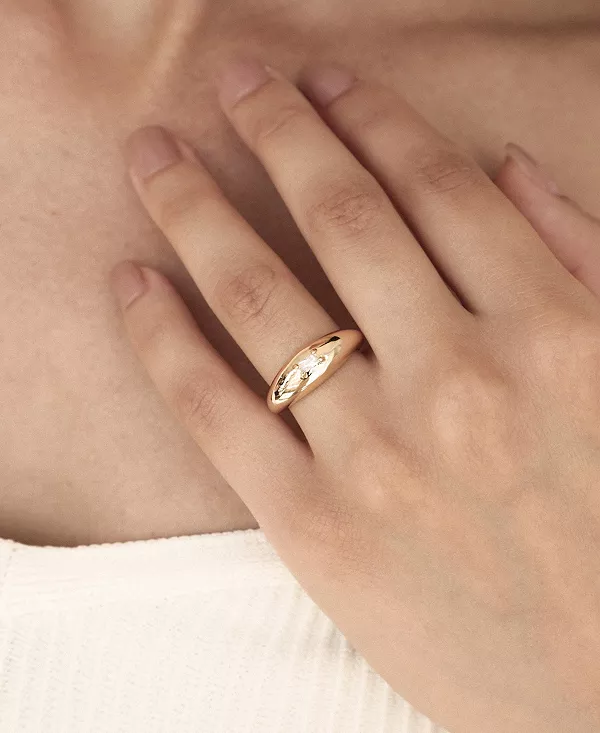 Кольцо «Овальный купол» багетной огранки отличается гладкой, полированной овальной формой, подчеркнутой одним сверкающим кристаллом багетной огранки. Это минималистичное, но элегантное кольцо добавит изысканного блеска и идеально подойдет для повседневного ношения или в сочетании с вашими любимыми украшениями.
