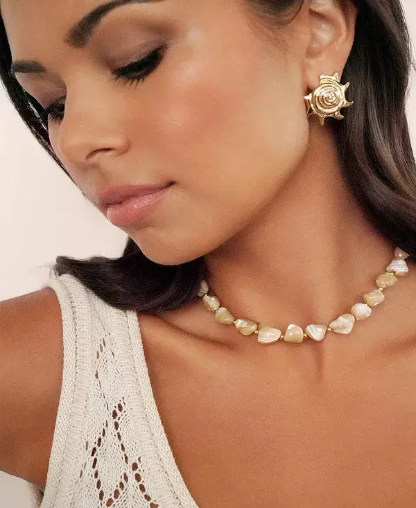 Ожерелье «Coastal Beauty» украшает воротник бусинами из настоящих ракушек и сверкает 18-каратным золотом. Подобно сокровищам, выловленным на волнах, оно – сияющая ода морской элегантности.