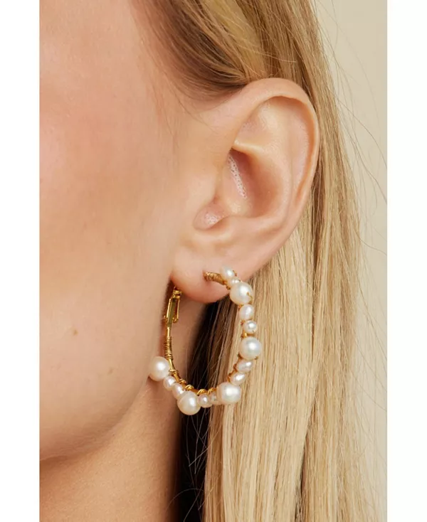 Жемчуг в проволочной оплетке добавляет объёма и очарования этим эффектным золотым серьгам-кольцам.