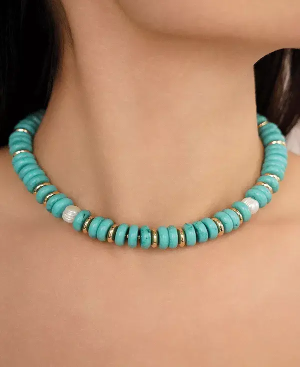 Ожерелье Amalfi, посвященное залитым солнцем берегам, украшает воротник яркими бирюзовыми бусинами, словно шепчущими о средиземноморском небе. Сияющее и освежающее, оно идеально дополнит пляжный образ.