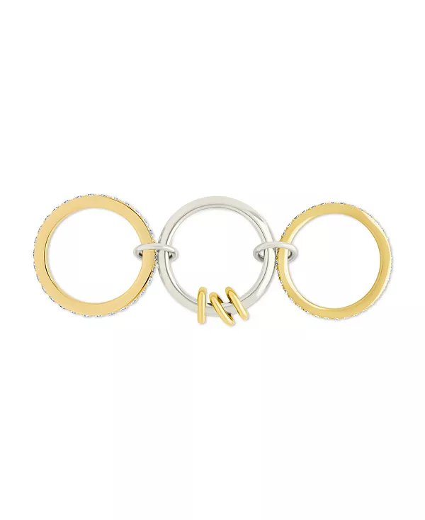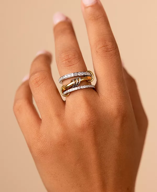 Этот комплект из трёх колец, созданный с использованием эффектного сочетания кристаллов в оправе паве, полированного золота и переплетающихся серебряных акцентов, соединяется двумя вращающимися застёжками, которые обеспечивают их сцепку. Этот комплект колец, вдохновлённый дизайнером, — последний тренд, сочетание разных металлов, ставший вирусным на подиумах и в TikTok.