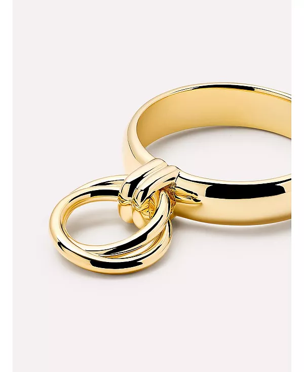 Это золотое кольцо, покрытое блестящим 14-каратным золотом, имеет классическую форму с двумя подвесными кольцами, которые придают ему уникальный и выделяющийся вид.