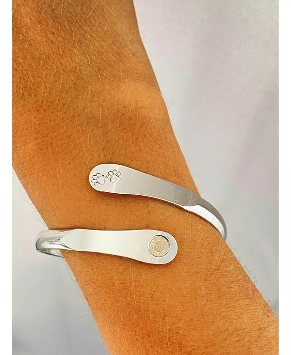 Регулируемая ширина браслета-манжеты 9 дюймов, 0,4 дюйма. Латунь с белым золотом/позолоченная латунь. Гравировка шрифта «Dancing Spirit»: «Furiends remain paw print in your heart». Импортный