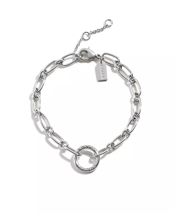 Изящный браслет с открытыми звеньями и круглым акцентом в центре, украшенным выгравированным логотипом COACH. Этот минималистичный повседневный браслет имеет регулируемую застежку.