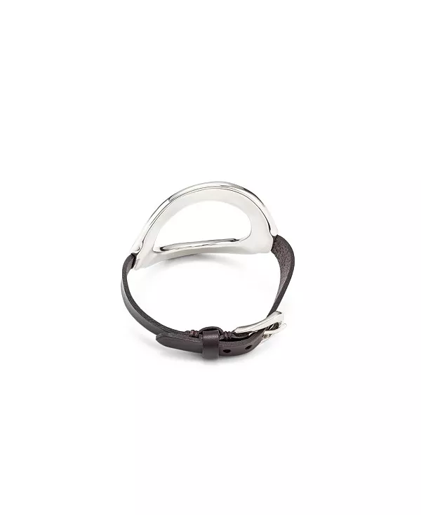 Браслет с крупным центральным металлическим элементом, покрытым стерлинговым серебром, и овальной застёжкой из сплава, покрытого 18-каратным золотом, и кожаной пряжкой. Это изделие воплощает суть UNOde50 благодаря полностью ручной работе.