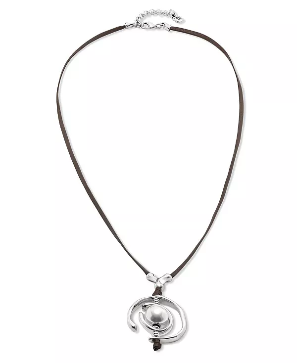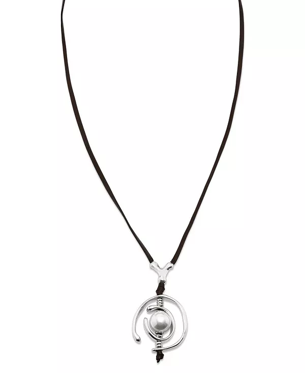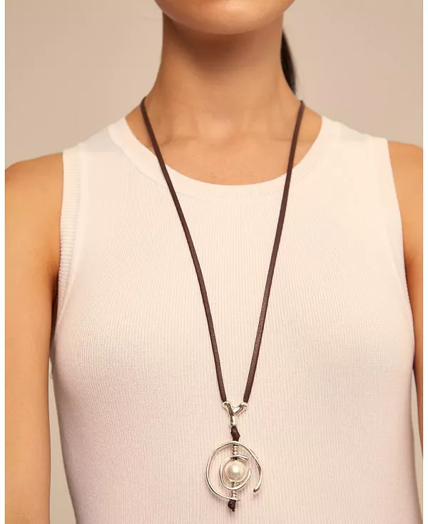 Длинное кожаное ожерелье с белым перламутром внутри посеребренной сферы.