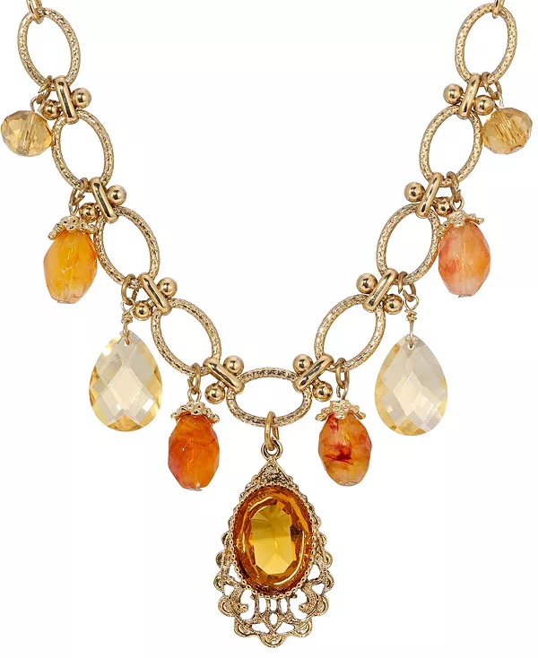 Это ожерелье украшено бусинами с эффектом сердолика и кристаллами с огранкой из светлого топаза, создающими потрясающую игру тёплых оттенков. Бусины и кристаллы элегантно свисают с текстурированных овальных цепочек, создавая сочетание изысканности и очарования.
