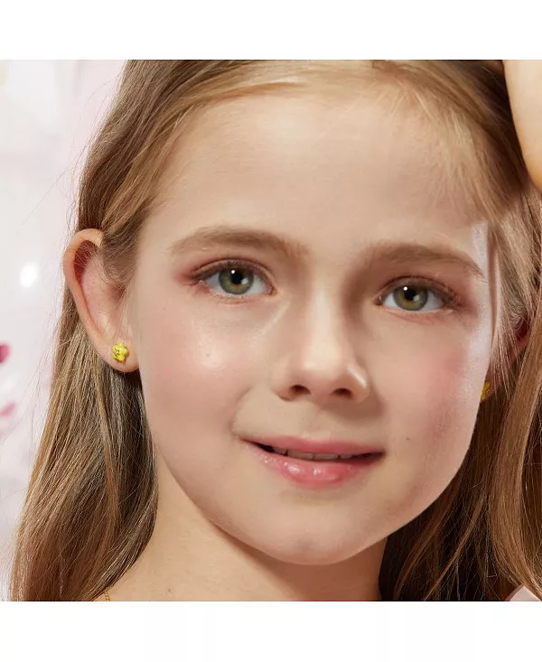 Эти изящные золотые серьги-гвоздики украшены весёлыми лимонно-жёлтыми цветами, каждый из которых украшен сверкающим кристаллом в центре. Нежные и очаровательные, они добавят нежности и яркости любой детской коллекции украшений. Изделие поставляется в фирменной розовой подарочной коробке.