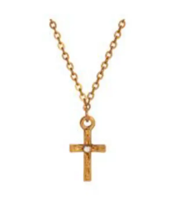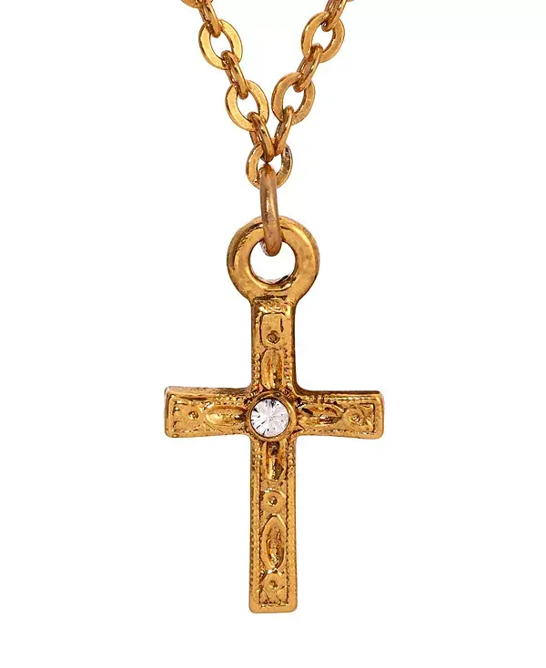 Это ожерелье украшено традиционным крестом, покрытым 14-каратным золотом, и очаровательным круглым прозрачным кристаллом в центре, излучающим утонченную, но поразительную элегантность.