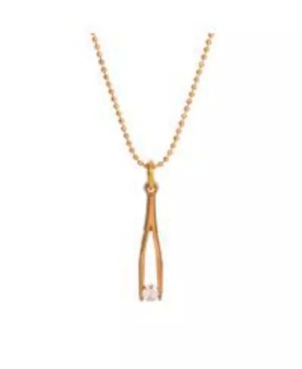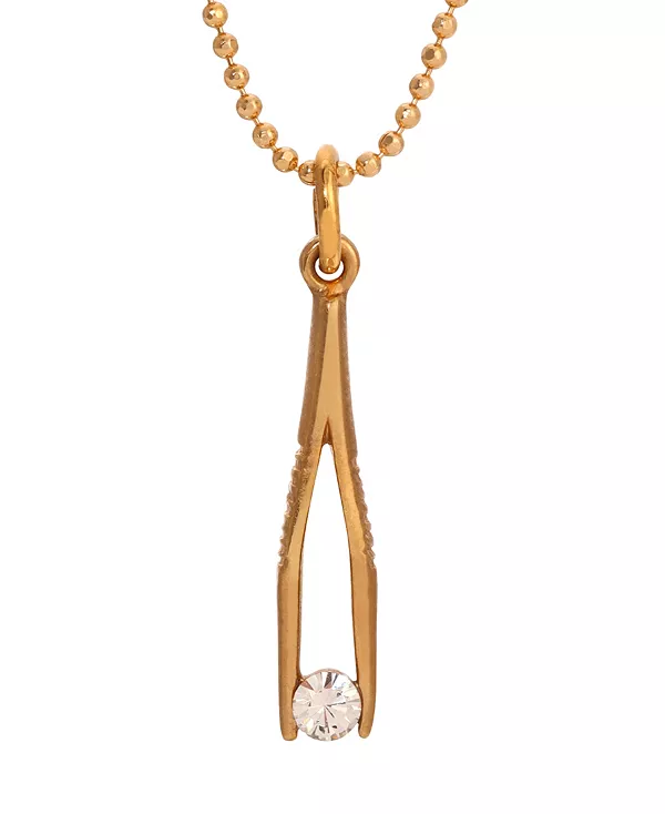 Это необычное ожерелье представляет собой ювелирный пинцет, окунутый в 14-каратное золото, который бережно удерживает миниатюрный сверкающий круглый кристалл.