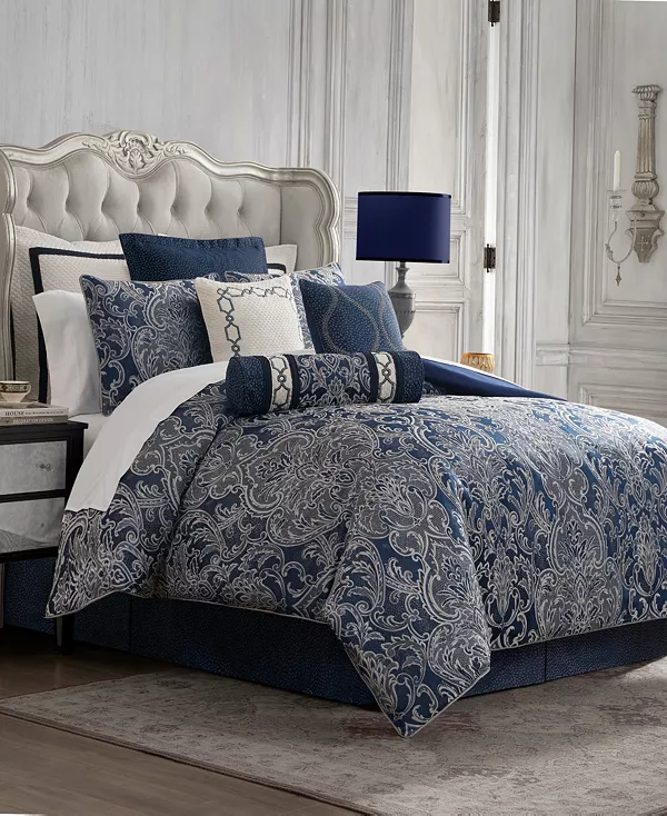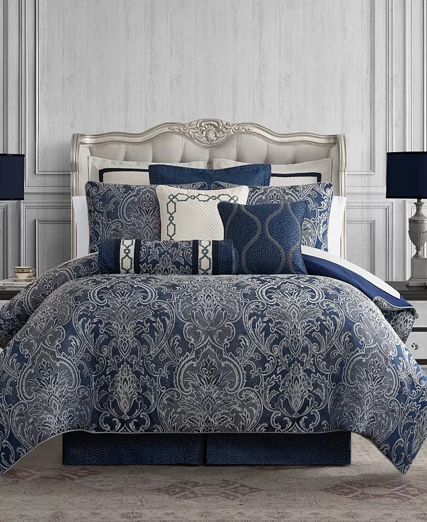 Элегантный комплект постельного белья Waterford Blarney выполнен из изысканного жаккардового полотна синего цвета с акцентами цвета слоновой кости. Одеяло и наволочки для подушек выполнены из многослойного жаккарда с цветущим арабесковым узором. Добавьте современного настроения с помощью синего подола с центральной складкой и мелким плетеным узором в виде гальки.