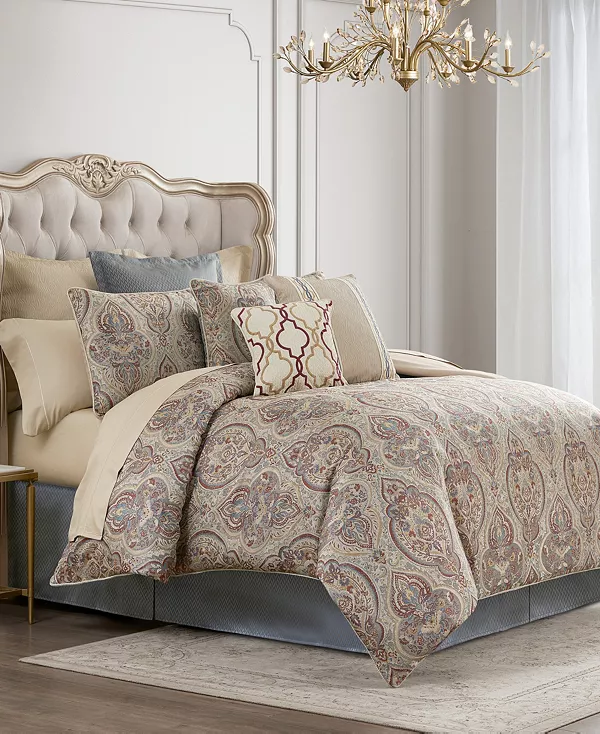 Многоцветный комплект постельного белья Waterford Lewiston с элегантным дамасским узором и изысканной отделкой. Одеяло с трёх сторон отделано плетёной отделкой. В комплект входит тканый подзор синего и золотого цветов.