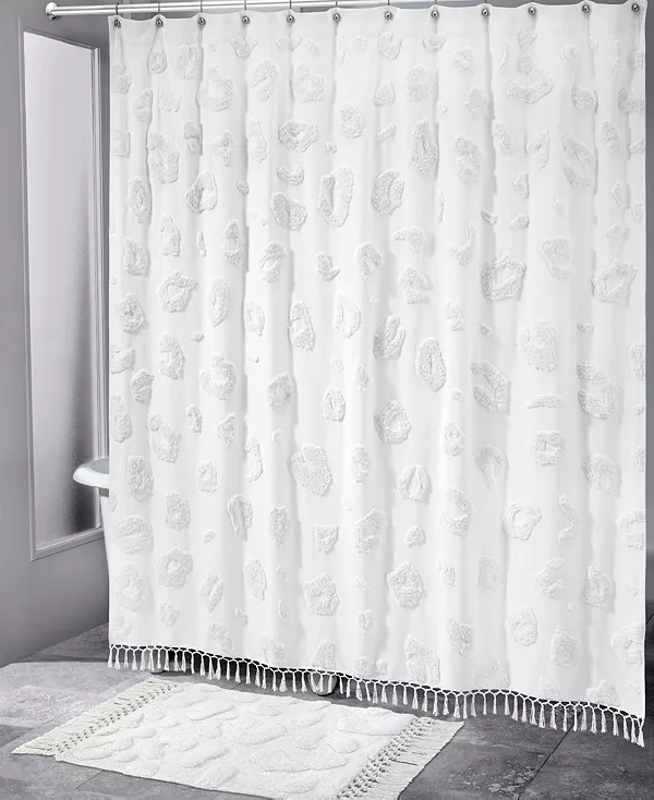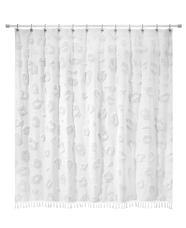 Штора для душа Nicole Miller Celina с текстурным леопардовым узором в тон. Состоит из 73% хлопка, 26% полиэстера, 1% вискозы, с тафтингом и отделкой кисточками по низу. Размер: 180 x 180 см. Можно стирать в стиральной машине и сушить в стиральной машине при низкой температуре. В комплект входят полотенца и коврик.