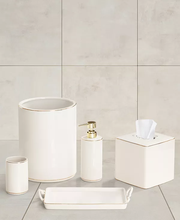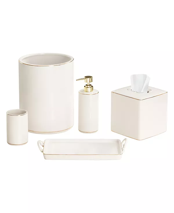 Добавьте в интерьер вашей ванной комнаты вневременную элегантность с помощью керамических аксессуаров для ванной Delphine. Этот набор с глянцевой отделкой цвета слоновой кости и изящной золотой отделкой придаст изысканности. Он идеально подходит для создания элегантного, гармоничного образа и стильного порядка в доме. Коллекция Delphine включает в себя дозатор для лосьона или мыла, стакан, туалетный столик, мусорную корзину и крышку для контейнера для салфеток.