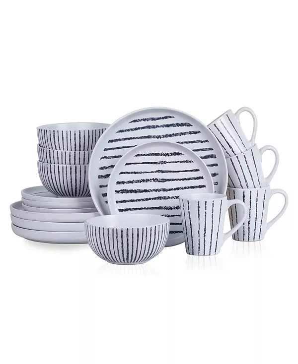 Повседневный, непринужденный стиль сочетается с богемными нотками в наборе столовых приборов Stone Lain Nova. Nova, готовая произвести ошеломляющее первое впечатление на вашем следующем званом ужине, отличается веселыми черными полосками, которые контрастируют с белоснежным фоном, что добавляет интереса к вашему столу.