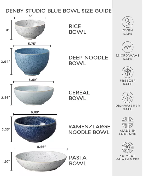 Универсальный размер набора для риса Denby Studio Blue, представленного в разнообразных пестрых оттенках, также идеально подходит для закусок, фруктов и других гарниров.