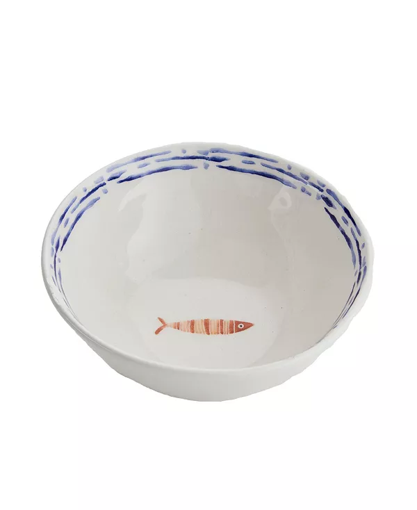 Чаша «Сардиния» – игривое дополнение к нашей коллекции Shore. Она изготовлена из керамики и украшена эксклюзивным рисунком Tableau. На дне чаши изображена маленькая рыбка, а по краю – синие полосы. Идеально подходит для соусов или кусочков фруктов.