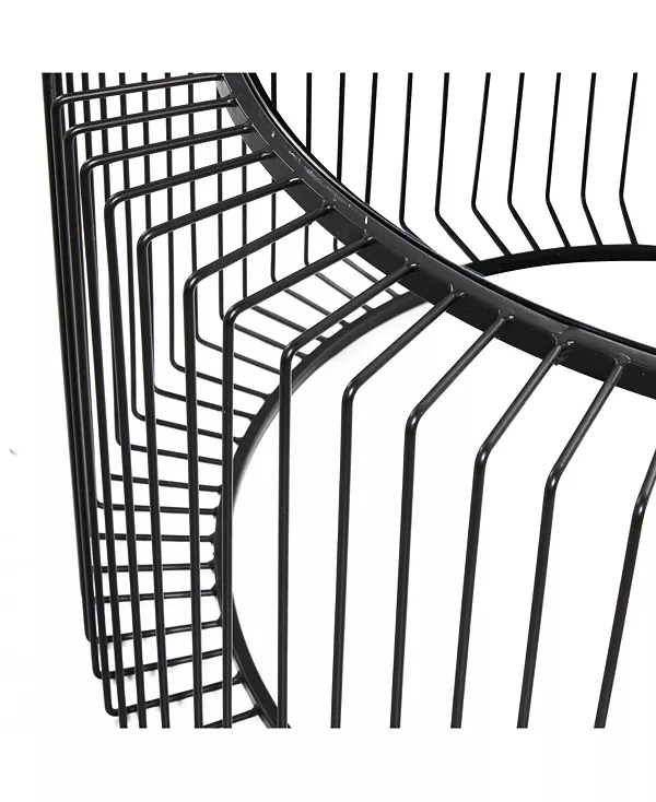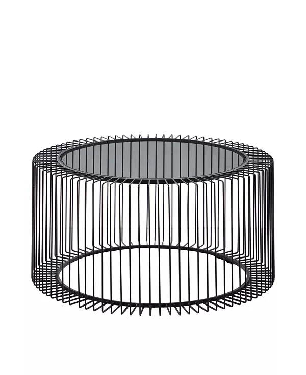 Этот круглый журнальный столик имеет круглую прозрачную стеклянную столешницу и чёрный металлический каркас с открытой конструкцией