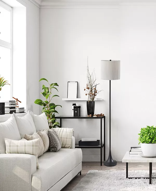 Элегантный плиссированный тканевый абажур белого цвета в форме барабана добавляет изысканности и прекрасно рассеивает свет.
