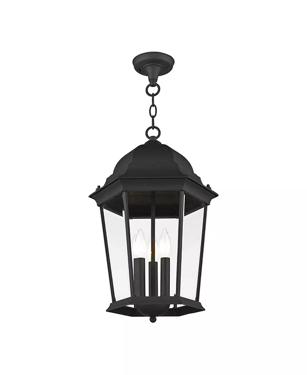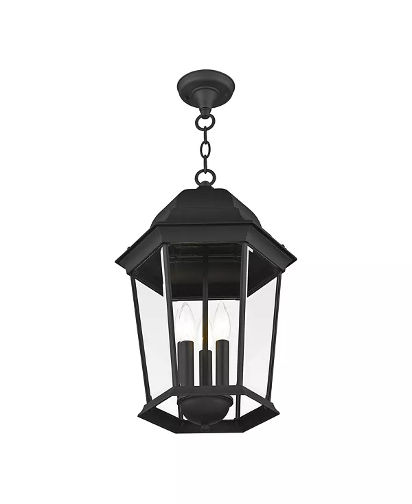 Элегантный силуэт коллекции Hamilton – это классика, которая обязательно удовлетворит даже самый взыскательный вкус. Этот уличный подвесной фонарь с тремя лампами имеет простую шестигранную раму с текстурированной черной отделкой и прозрачным скошенным стеклом.