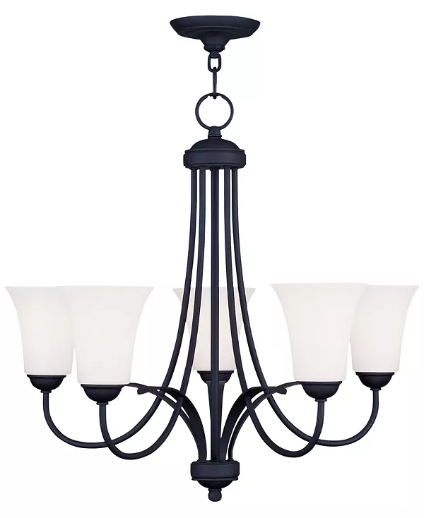 Современное прочтение традиций, 22-дюймовая люстра ручной работы Ridgedale подойдет для переходных помещений или столовых. Основание в форме канделябра украшено выдувными вручную плафонами в форме колоколов и выполнено в современном черном цвете.