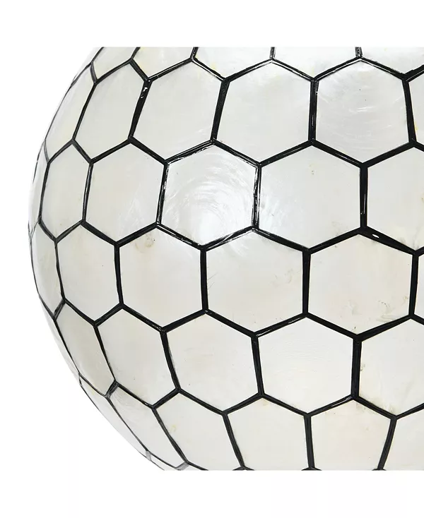 Этот эффектный круглый потолочный светильник изготовлен вручную из перламутровых ракушек Capiz, обрамленных металлическими сотами.