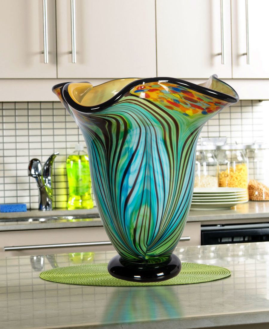 Спокойные, умиротворяющие тона нашей вазы Kalima Art Vase добавят нежный цветовой акцент любому интерьеру вашего дома. Ваза большого размера выполнена из белоснежного художественного стекла Favrile Art Glass. Абстрактный узор из листьев в спокойных сине-зеленых оттенках продолжается на ней.