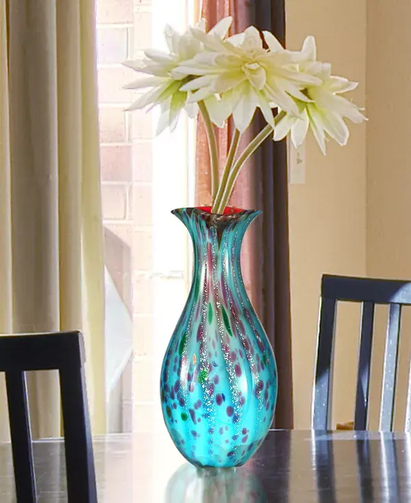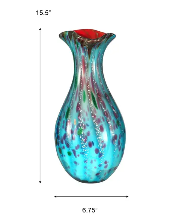 Успокаивающие цвета нашей вазы Lagood добавят непринужденного дизайна вашему дому или офису. Эта величественная ваза-урна выполнена в небесно-голубом цвете, дополненном изящными разноцветными каплями и завитками. Внутренняя часть вазы выполнена из яркого стекла. Размеры: 16,75 x 16,75 x 45,5 см. Выдувное художественное стекло ручной работы. Аксессуары. Ваза. Синее стекло. Протирать.