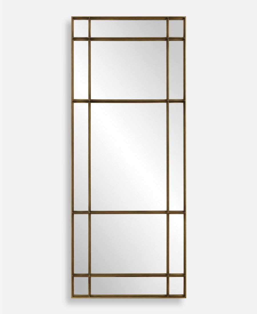Это огромное зеркало имеет массивную железную раму с глубокими канавками, напоминающими оконные проемы домов. Отделанное состаренным золотом, оно добавляет нотку индустриального шарма и вневременной элегантности любому помещению.
