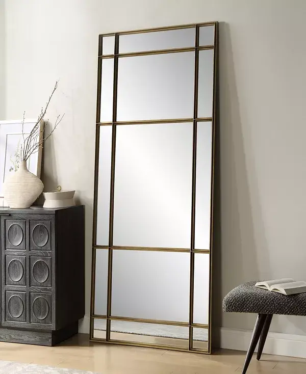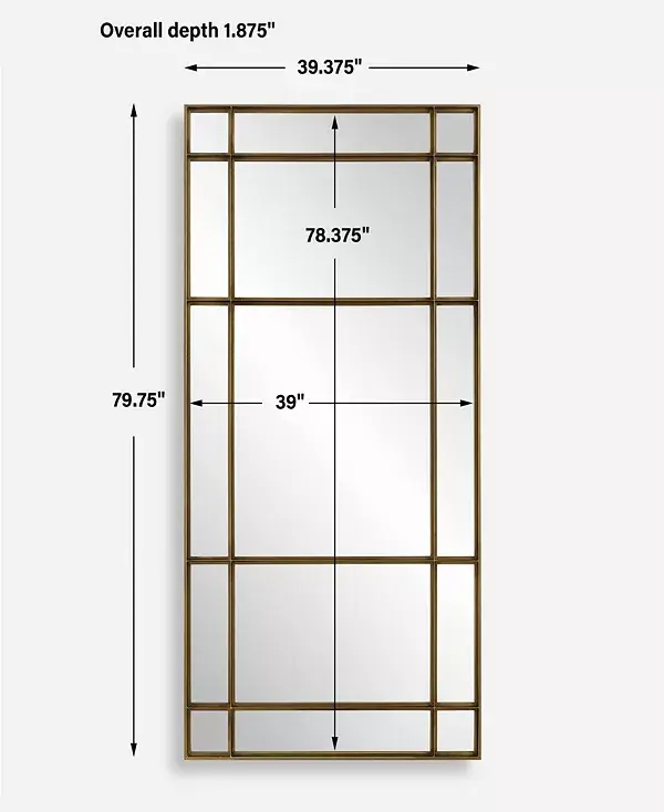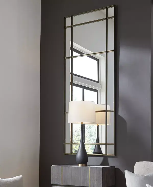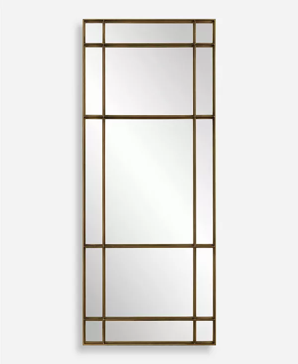 Это большое зеркало в тяжёлой железной раме с глубокими канавками, напоминающими окна домов. Отделка из состаренного золота придаёт любой комнате индустриальный шарм и непреходящую элегантность.