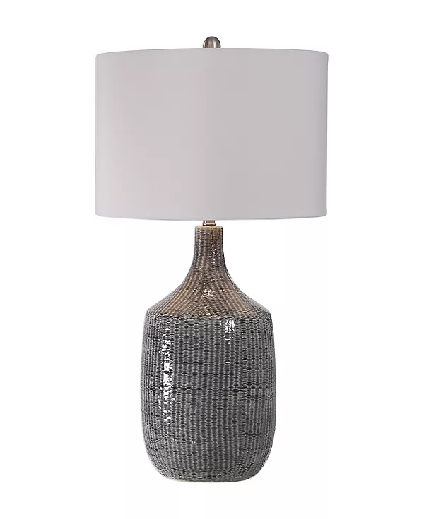 Эта керамическая настольная лампа, вдохновленная старинной керамикой, имеет отделку под состаренный камень с характерными потертостями и тёмными оттенками, подчеркнутыми гальваническим покрытием из матового никеля. Абажур в форме барабана обтянут светло-серой льняной тканью.
