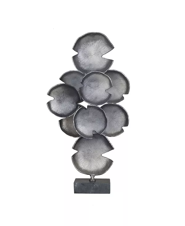Серая металлическая отделка с ребристым радиальным узором подчеркивает эту абстрактную скульптуру
