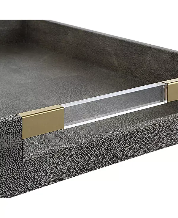 Поднос покрыт элегантной искусственной шагреневой кожей с прозрачными акриловыми ручками и акцентами состаренного золота.