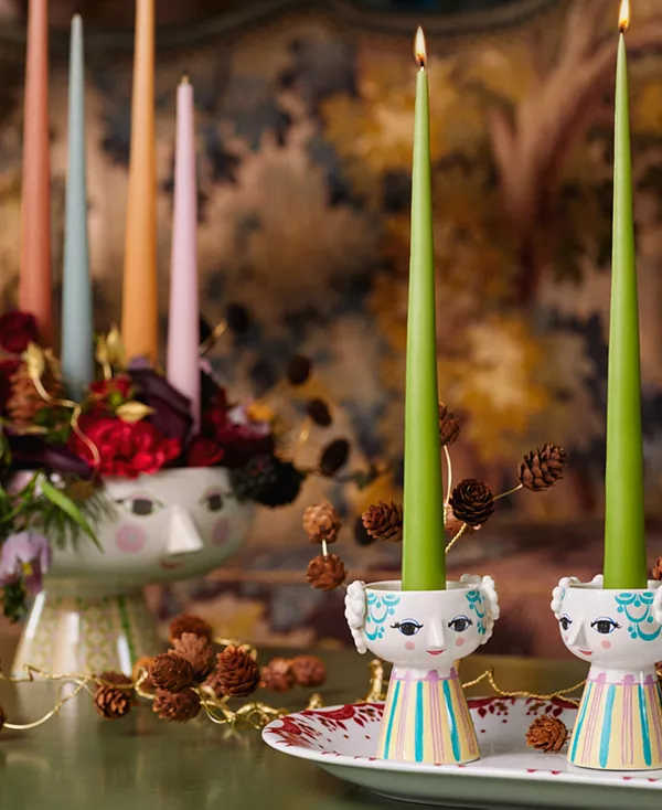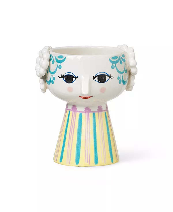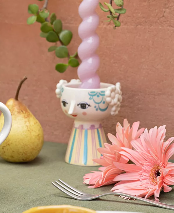 Подсвечник Eva с розовыми щечками от Bjørn Wiinblad в светло-голубом, желтом и сиреневом цветах. Подсвечник подходит как для подсвечников, так и для чайной свечи. Подсвечник Eva изготовлен из глянцевой глазурованной керамики с цветной наклейкой и вдохновлен оригинальными вазами Eva от Wiinblad, которые имели широкую головку с цветочным орнаментом и конусообразный корпус. Изящный циферблат взят из оригинальной коллекции Wiinblad, а узор платья – это переосмысление иллюстраций Бьёрна Вайнблада.
