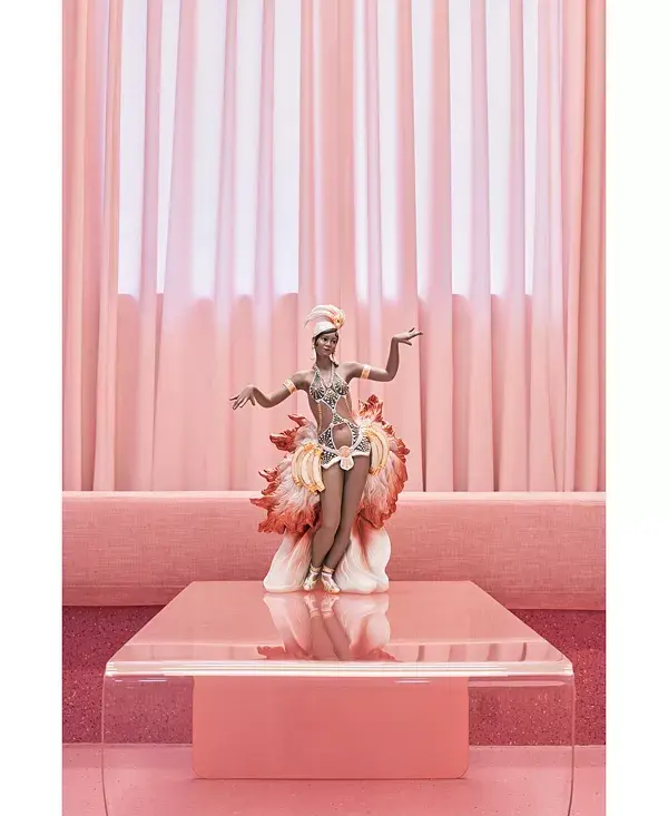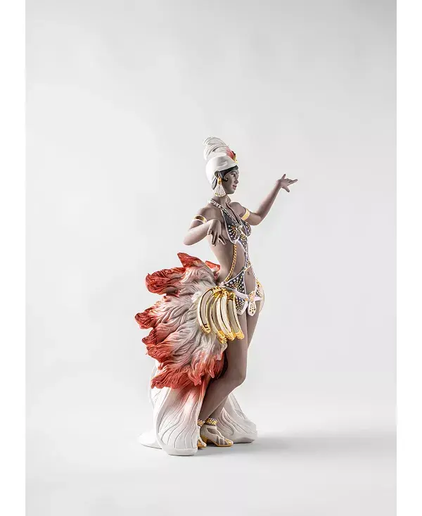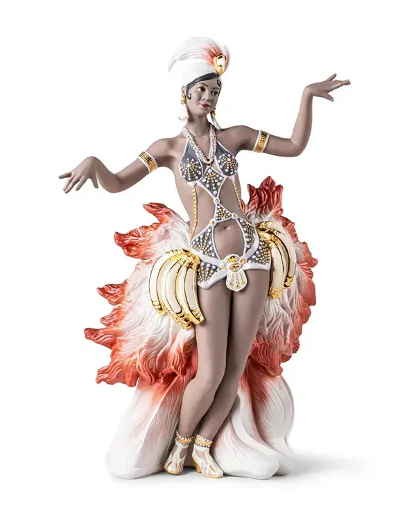 Фарфоровая скульптура экзотической танцовщицы из золотого века кабаре. Это был золотой век джаза и кабаре, ар-деко и авангардного искусства. Театры и сцены оживали под африканские ритмы, экзотику и жизнерадостность. Это творение – дань уважения целой эпохе и неповторимому художественному стилю. «Богиня из черного дерева» изображает танцовщицу, полную ритма благодаря движениям, переданным формой, одеждой и богатством цветовой гаммы, выбранной для декора. В этом творении есть много выдающихся элементов, таких как отделка платья золотыми штрихами, детальная прорисовка перьев и выразительность глаз танцовщицы. Внимательное рассмотрение открывает работу, поражающую богатством деталей. Богиня из черного дерева — одно из тех творений, которое способно перенести нас в смелую и дерзкую ушедшую эпоху.
