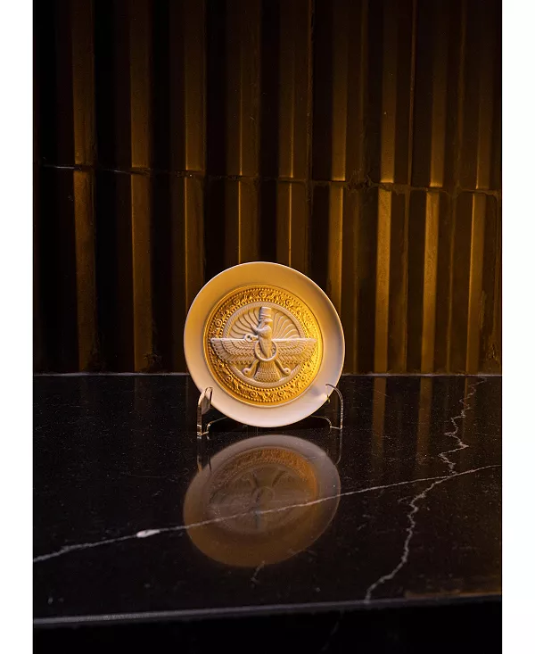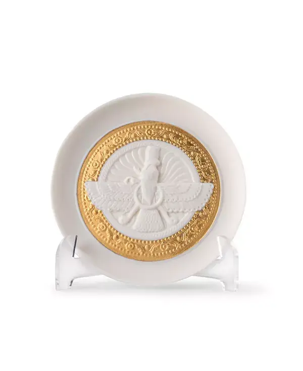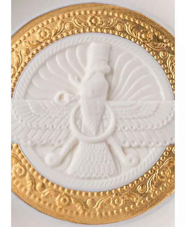 Фарфоровая тарелка с изображением фаравахара, защитного символа, который носят представители общины парсов, потомки персидских зороастрийцев. Для общины парсов, потомков персидских зороастрийцев, важной части индийской культуры, фаравахар олицетворяет мудрость старости. Это защитный символ с различными значениями, ангел-хранитель, воплощающий одно из главных учений религии – жить с добрыми мыслями, словами и поступками. Также считается, что он символизирует победу света над тьмой. В барельефе тарелки, выполненном художниками Lladró, священная фигура фаравахара подчеркивается тонким орнаментом и элегантным контрастом между чистотой белого фарфора и золотистым блеском окружающего его круглого фриза.