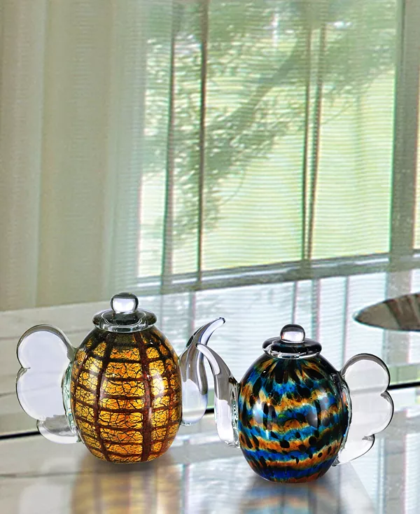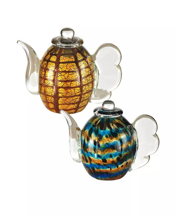 Этот очаровательный набор из двух чайников станет прекрасным подарком, который обязательно понравится любому получателю, даже если этим получателем будете вы. В набор входит пара декоративных чайников. Первый чайник выполнен из золотисто-янтарного стекла с эффектом кракле, покрытого