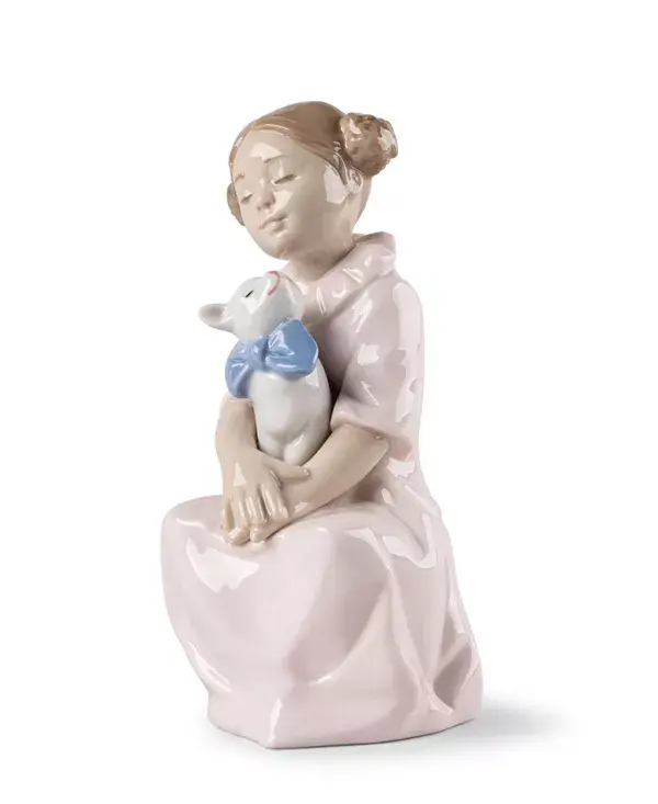 Фарфоровая статуэтка Nao «Девочка с кошкой» из детской коллекции, созданная Франсиско Полопе в 2023 году. Декоративная фарфоровая статуэтка девочки в светло-розовом платье, сидящей с закрытыми глазами. На коленях у неё белый кот с синим бантом на шее.